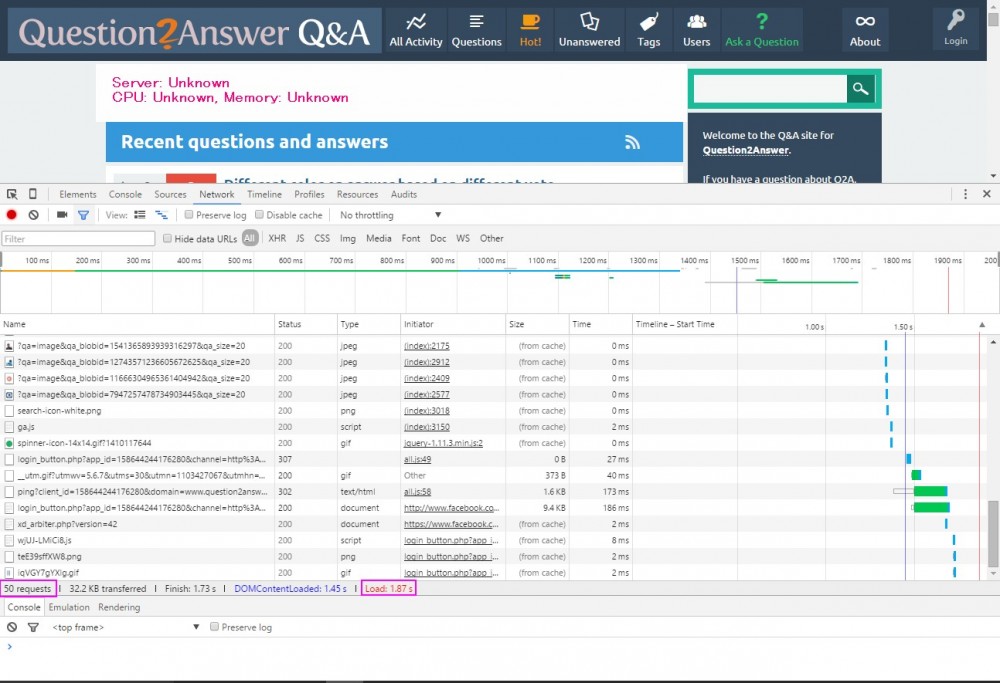 Q2A (Server: Unknown): 50 requests, 1.87 sec